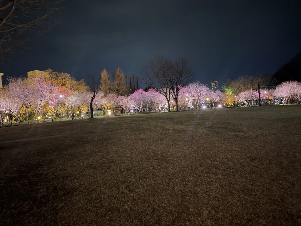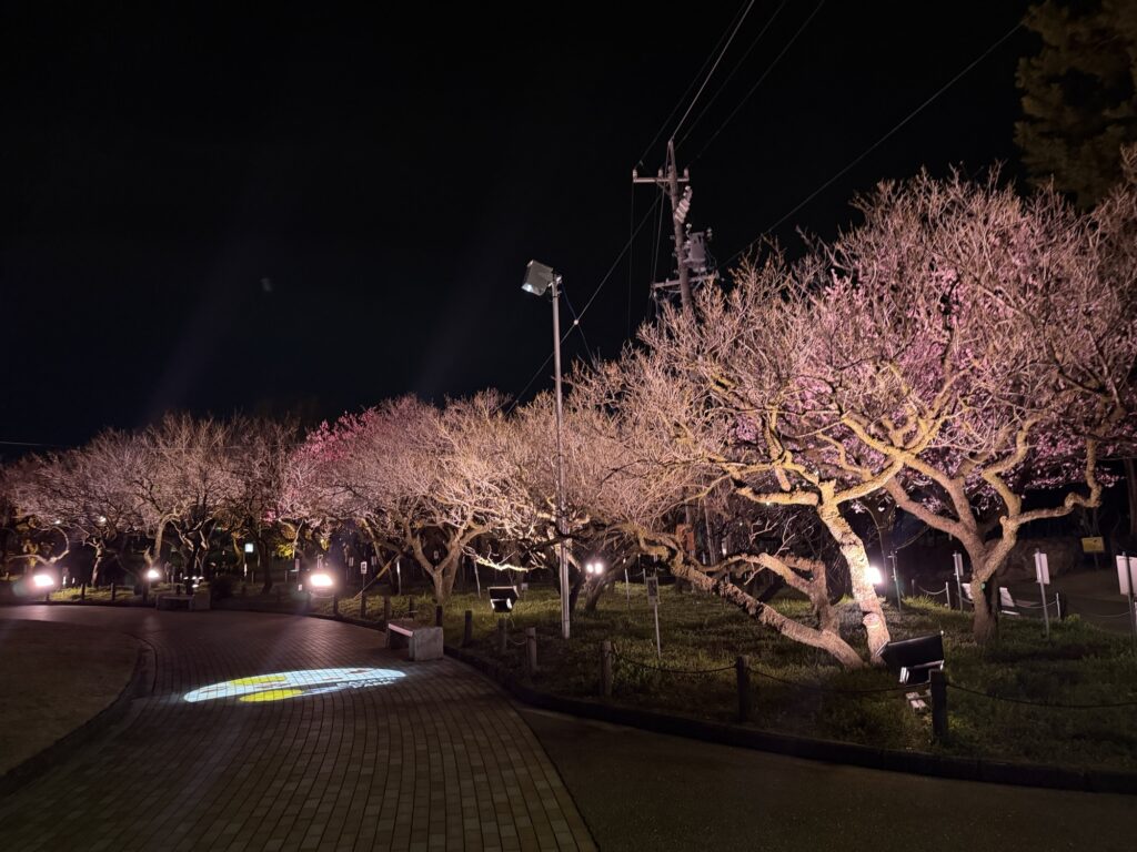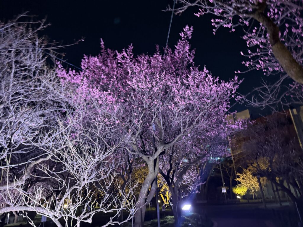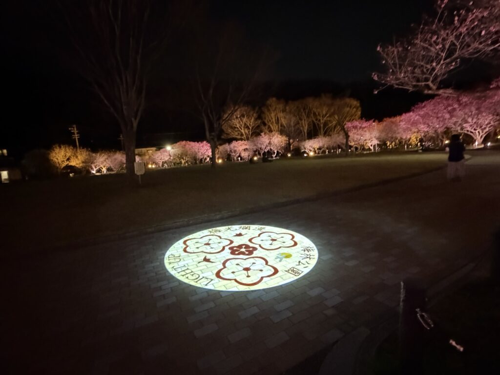 梅林公園のライトアップ 地域活動 2026.03.14 梅林公園で2月10日(火)から始まっているライトアップが、今週末3月15日(日)までとのことで見に行ってきました。 50種類約1,000本の桜が中央の芝生広場の周りに植えられておりライトアップで白やピンクの梅が鮮やかに浮かび上がっています。 去年と同様公園の路面には梅花をイメージした光の演出がクルクル回っていました。 昼とは違うイメージの美しい梅林でした。 夜は寒さが厳しいので、寒さ対策をしっかりしてお越しください。